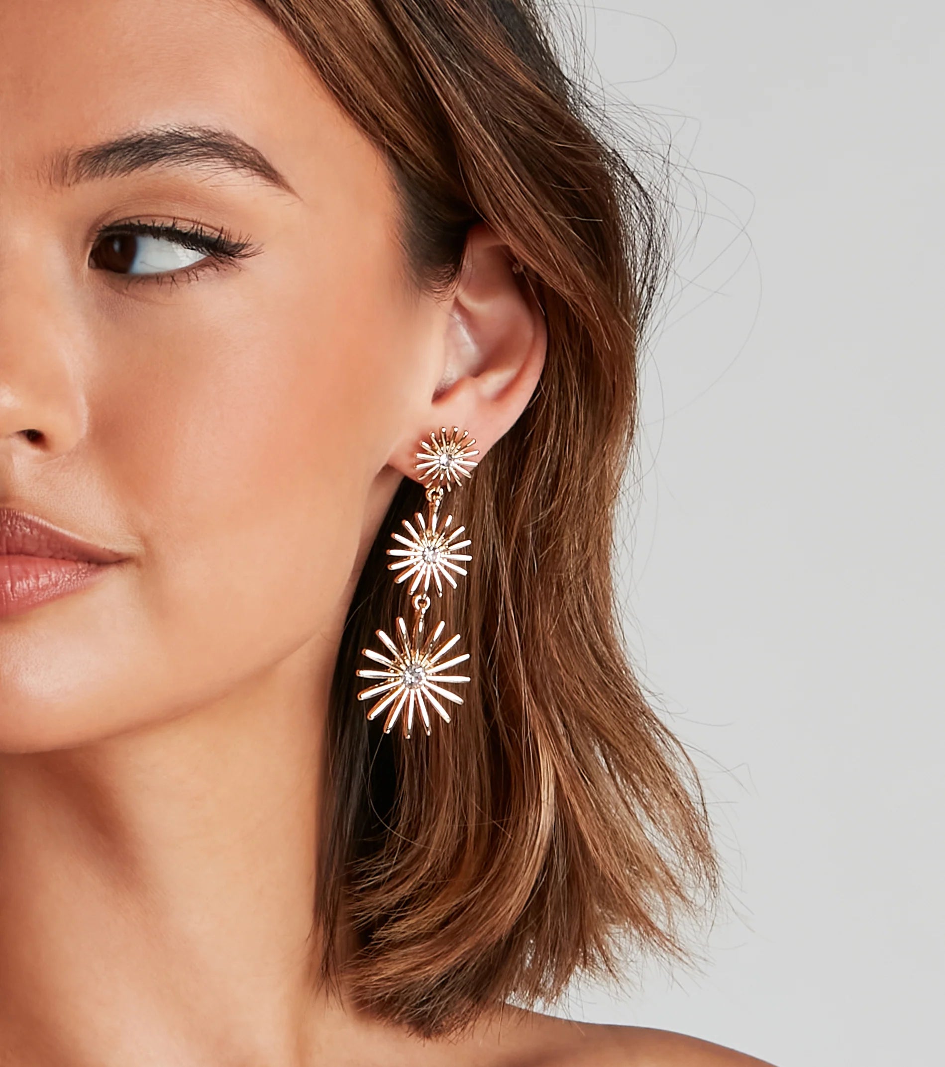 Make a wish and these starburst earrings will be yours! They feature a linear silhouette, rhinestone insets, and a post-back closure. Complete the look in a matching set for a cute daytime outing.