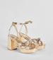 Make it your moment as you strut into the party wearing these metallic platform heels! They feature an open square toe, a knotted strappy design across the foot, an adjustable ankle strap, a heel strap, a platform sole, and a tall block heel. The metallic sheen will catch everyone's eye. Complete your look with rhinestone fringe earrings.