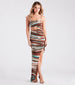 Showcase a marvelous style in this trendy marble print maxi dress! It features a sleeveless square neckline, spaghetti straps, an asymmetric side cutout at the waist to add a sultry vibe, ruching down one side seam with an adjustable drawstring, an asymmetric maxi-length hem creating a thigh-high side slit, and a curve-hugging silhouette. The all-over eye-catching marble print pattern on the smooth and stretchy knit fabric will draw all the attention to you! Complete your summer party look with clear heels.