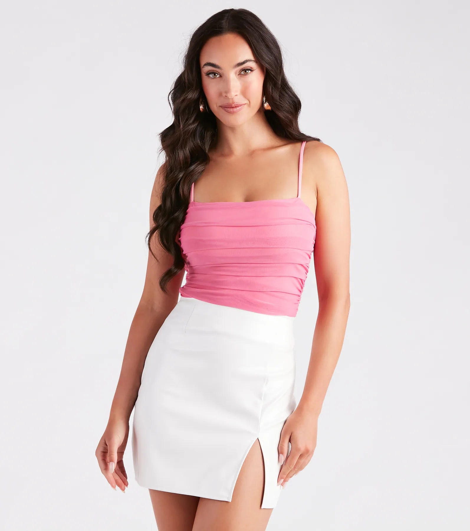 Don't mess around cause this crop top won't be here for long! Add-to-cart this cute top to style with your day or night wear. It features a sleeveless square neck, adjustable spaghetti straps, side, and back ruched seams, and a mesh overlay with a sewn-in knit lining. Complete the look in a sleek mini skirt for dinner and drinks!