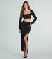 Bring the glitz and glamour as you party past midnight in this rhinestone maxi skirt! It features a high-rise waist, a maxi-length hem with an iconic thigh-high side slit, a form-hugging silhouette, and a front embellished design of gleaming mini rhinestones. The metallic lurex threading in the sweater knit fabric will give off a stunning shine. Complete your party look with the matching crop and stiletto heels.