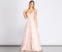 Romance is in bloom in our captivating Misha ball gown! She creates a twirl-worthy moment with her elegant organza and burnout floral print!