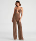 Make the whole place shimmer sparkling in this halter glitter jumpsuit featuring a sleeveless bodice, drawstring neck with tie closure, a front keyhole cutout, and a straight-leg silhouette. Complete your radiant look in earrings for a cocktail dinner!
