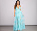 Enchant in this long tulle formal dress featuring a sultry plunge V-neckline and empire waist that leads to dual high front slits along the sweeping floor-length silhouette. Perfect for weddings or black tie soirees.