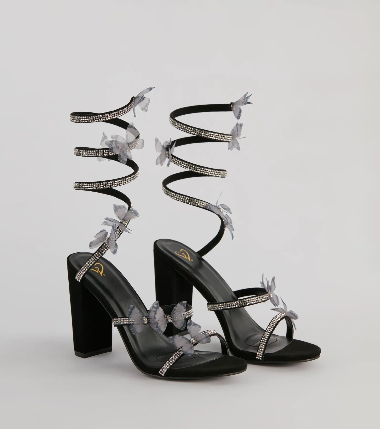 Step out looking like a mythical babe in these statement stiletto heels for a truly exclusive look! These heels are designed with a sleek almond toe, sparkling rhinestone spiral strap adorned with butterfly printed organza appliques, and a sleek stiletto heel. Made from iridescent metallic material, these heels will add a touch of magic to any outfit! Complete the look with a fab skater dress for a party!