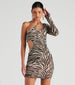 Give everyone at the party just the highlights of you in this sassy zebra print mesh dress featuring a one-shoulder neckline, long sleeve, spaghetti strap, and a sultry side cutout along the bodycon silhouette. Complete the look with rhinestone earrings.