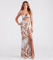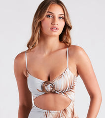 Packing this gorgeous tropical print maxi dress in your carry-on is a must for your vacay getaway! It features a sleeveless V-neckline with an O-ring accent at the bust, a sultry waist cutout at the front, adjustable spaghetti straps, a fitted, flowy, floor-length hem, and a thigh-high front slit. The smooth knit fabric showcases a tropical palm leaf print. Style with cute wedges.