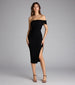 When you walk in, the night officially starts. This off-the-shoulder midi dress is all about shaping curves and serving quiet luxury with a bold slit. Perfect for date nights and dressy events!