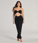 Have all eyes on you in this strapless maxi dress boasting a sweetheart twist neckline and a cutout bodice. The smooth knit fabric hugs your curves along the form-hugging silhouette and creates a front center ruffle design.
