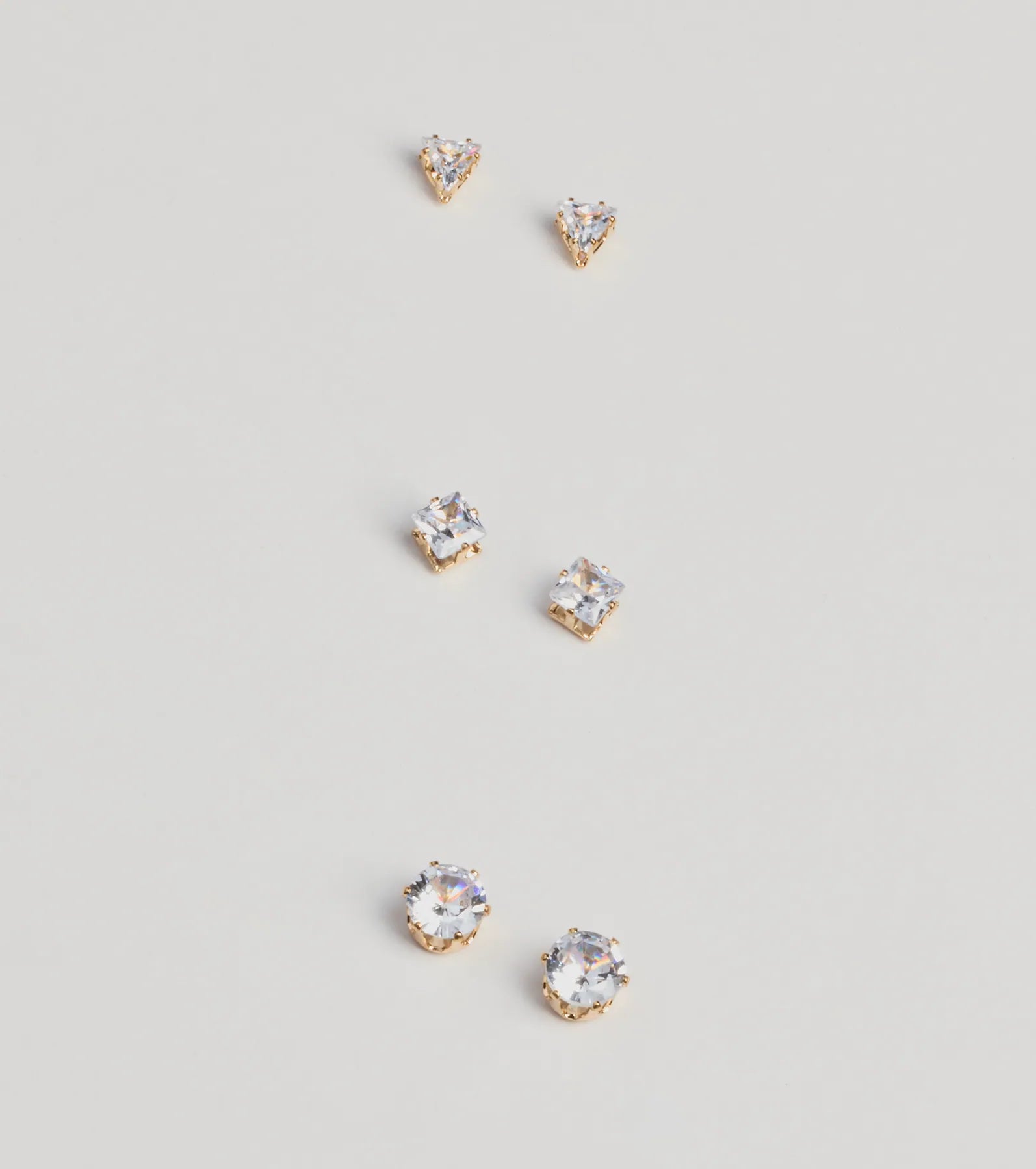 The perfect set of cubic zirconia stud earrings? Say less! This luxe multipack features three pairs of studs, including triangle, diamond-shaped, and round cubic zirconia stone designs for the prettiest sparkle.