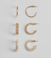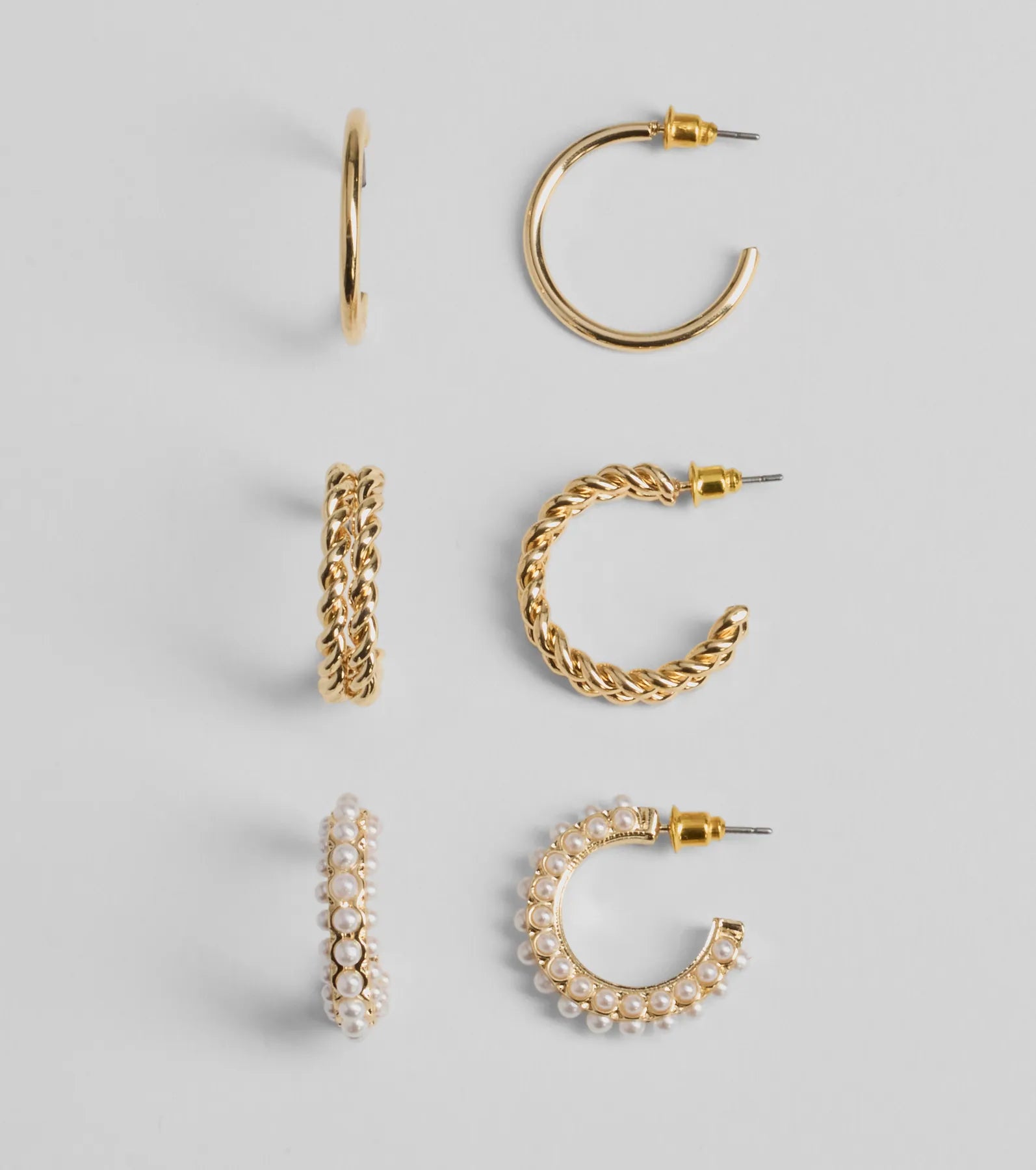 This three-pack hoop earrings set features one pair of sleek hoops, one pair of twist hoops, and one pair of faux pearl hoops. Perfect for styling with your everyday outfits.