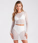 Have a glamorous night looking like a queen in this mesh crop top featuring fitted long sleeves, a crew neck, and all-over rhinestones and faux pearl embellishments. Complete the look with matching bottoms and heels.