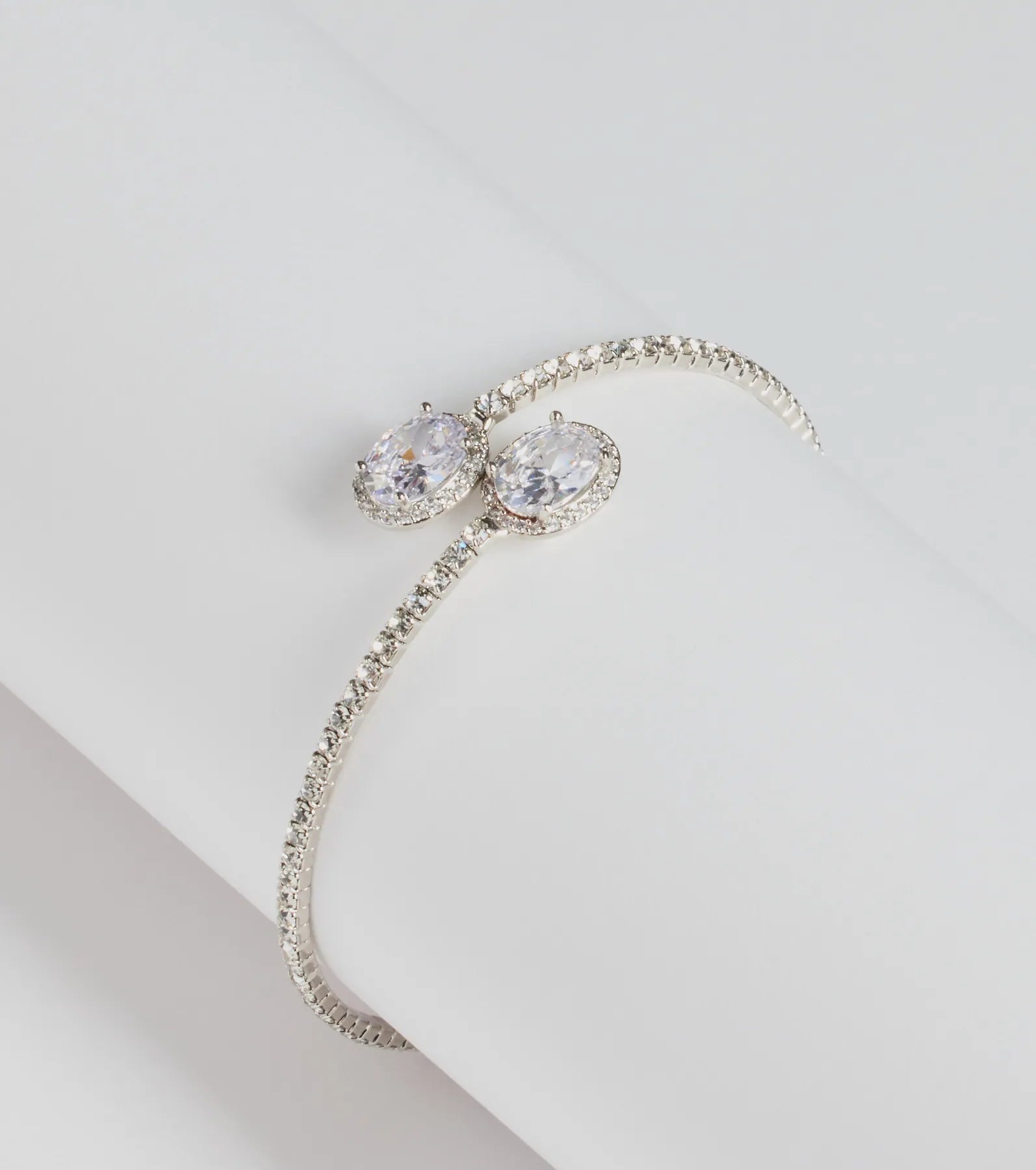Let everyone know your glam taste with this rhinestone memory wire bracelet perfect for adorning an exclusive style! Complete the look with earrings.