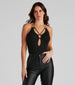 Raise the bar in this sultry-chic sleeveless bodysuit! It features a deep V-neckline with halter spaghetti straps, a caged front design with sleek O-ring accents, a small cutout under the bust, and a form-hugging fit. Style this bodysuit with high-rise denim and strappy mules for a casual night out look.