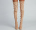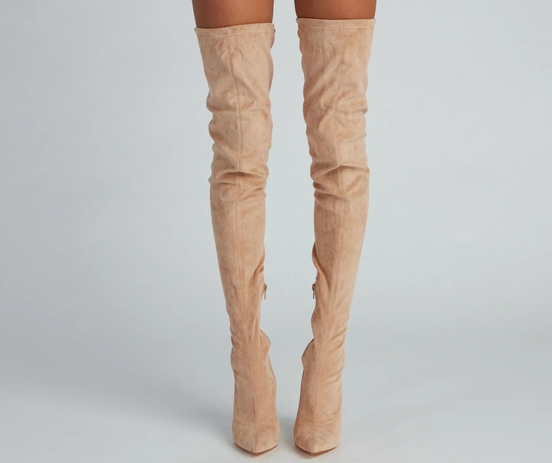Raise the bar with boots that keep your look on point! The boots feature an over-the-knee fit, a lace-back accent, an inner zipper closure, a pointed toe, and a stiletto heel. The boots are composed of a faux suede material. Complete look with a ribbed mini dress and dainty necklaces.