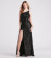 Radiate gorgeous glamour at Homecoming in the Rayne sequin formal dress! She features an asymmetric one-shoulder neckline with dual spaghetti straps, an open back with an asymmetric strap accent, ruching at the waist, a floor-length hem, a faux wrap-front design creating a high slit, and a slim-fit silhouette. The all-over sequin embroidery will shimmer and shine all night long. Complete your look for a black-tie event with strappy stilettos.