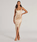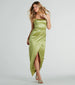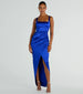 Effortlessly alluring, the Rebecca satin slim-fit formal dress is a must-have for weddings, parties, or any special affair. She features a sleeveless square neck and back design, tank shoulder straps, a corset-inspired bodice with a fitted high waist seam, a floor-length hem with a faux wrap-front creating a slit, ruched detailing, and a slim-fit silhouette. The silky satin-knit fabric offers a moderate stretch. Complete your look with this chic formal dress with platform heels.