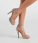 Reign the night with heels that bring in the glamour! The heels feature rhinestones, an adjustable ankle strap, a closed back, an open almond toe with a single strap over the toe, a wide platform, and a stiletto heel. The heels are composed of a glitter mesh material. Complete look with a formal satin dress.