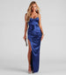 Bring the glamorous energy in the gorgeous Reyna satin formal dress! She features a sleeveless sweetheart neckline with dazzling iridescent heat stone embellishments, a pleated and padded bust, and adjustable spaghetti straps for a customized fit. The corset-designed bodice leads to a high waist seam with ruching, a curve-hugging floor-length skirt, and a thigh-high side slit. Complete the look with glitter heels.
