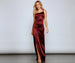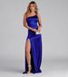 Create a strikingly gorgeous formal look in this one-shoulder long satin dress. Captivate in this eye-catching design with a one-strap detail made with luxurious stretch satin for a curve-huffing fit and accented with a revealing side slit. Make a stunning entrance in this long formal dress styled with sparkly rhinestone jewelry and matching heels for a dazzling picture-perfect look.
