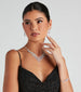 Make jaws drop adorning your formal occasion wear in this necklace, earrings, and bracelet set. The jewelry set features matching rhinestone embellishments and designs perfect for styling with dressy stiletto heels.