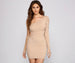 Show off a hint of skin in this ribbed knit mini dress! The dress features a one-shoulder neckline, a ruched lightly padded long sleeve, a sexy side cutout with ruched drawstring, and a mini length silhouette. The dress is composed of a ribbed knit fabric that offers a form hugging fit with a moderate stretch. Complete look with clear mules.