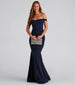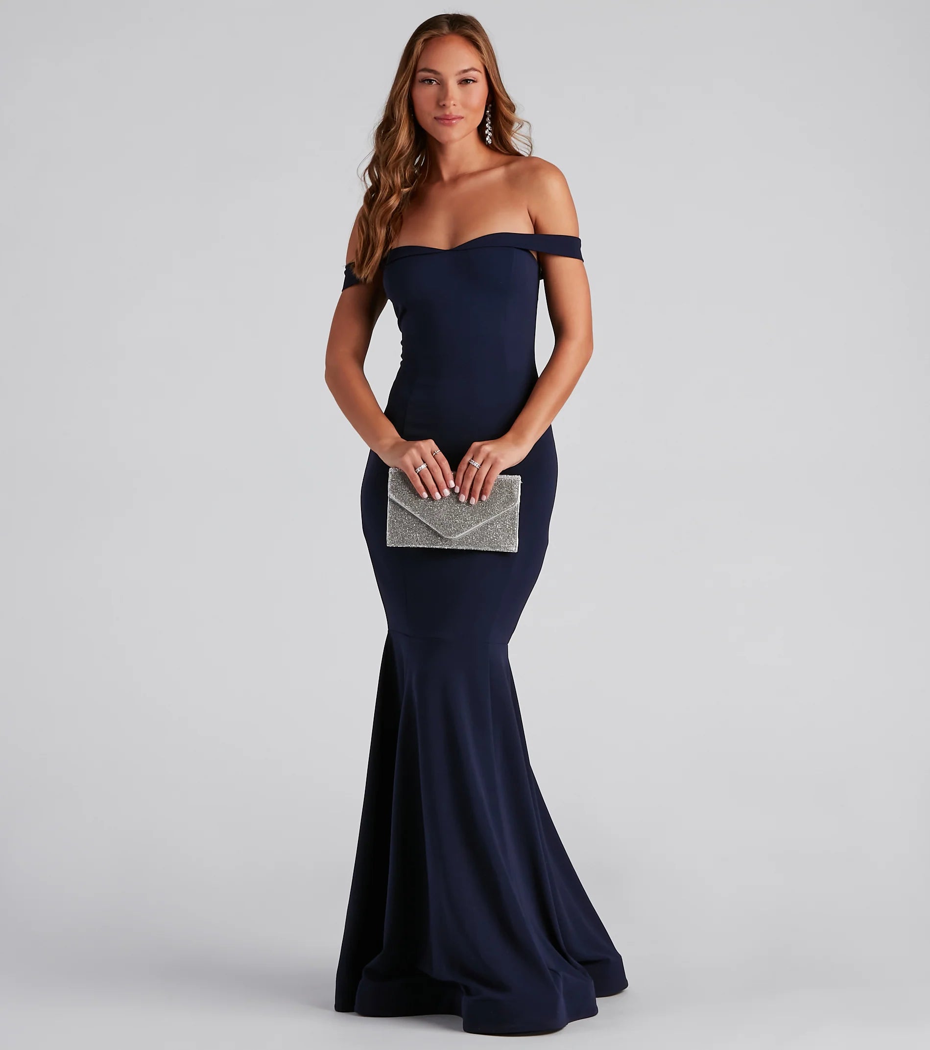Keep it radiant in the Rochelle dress! Make a sensational entrance at your next special event in this formal crepe dress featuring a stunning off-the-shoulder neckline with a sweetheart bust that cascades off the shoulders, and a built-in bust for support. The vertical seams on the bodice create a streamlined look on the flared mermaid silhouette that highlights curves to create an hourglass effect. Complete your formal outfit with rhinestone heels and a sleek satin clutch.