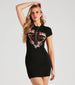 If you're a rock babe this graphic short dress is the one for you! It features short sleeves, a crew neck, a front lace-up placket, and graphic detail with a script that reads, 'Rock N Roll World Tour' along the fitted hem. Complete the look in over-the-knee boots.