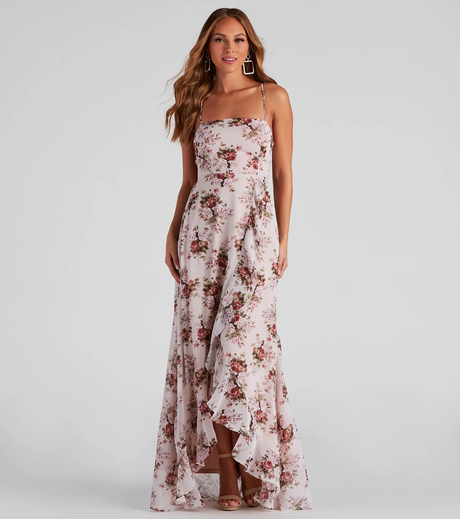Lace up in a formal dress that brings the romance! Rue features a pretty floral pattern, a sleeveless square neckline with padded cups, spaghetti straps that lead to a cross-back, and a lace-up back. Her slim fit bodice leads to a flowy wrap silhouette with a high side slit that is accented with a ruffled trim. The dress is composed of a lined of a lightweight woven fabric that offers a relaxed fit with minimal stretch. Complete look with wedges and a straw hat.