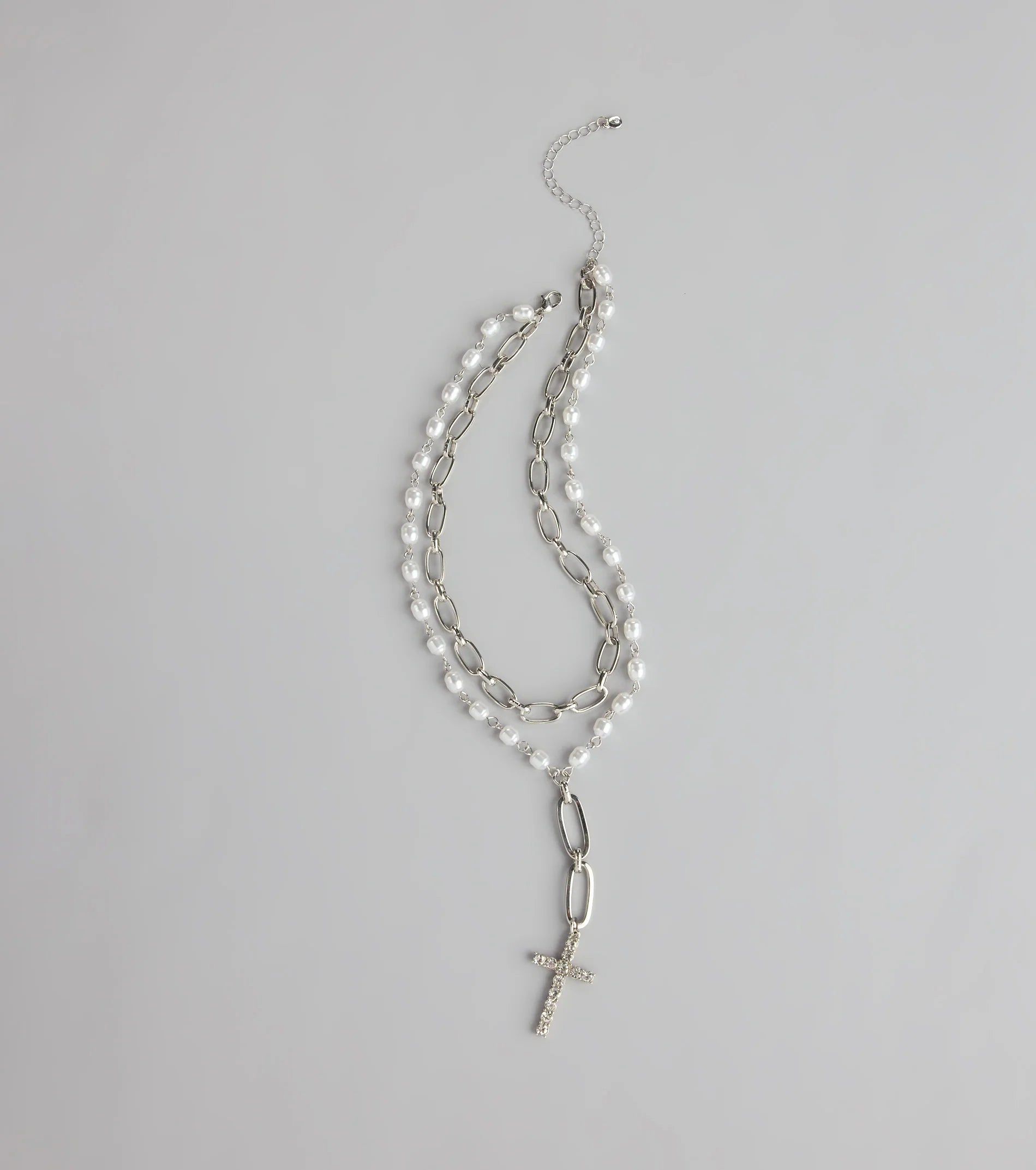 A little glam, a little edge—this layered necklace mixes pearls, chunky chain links, and a sparkling cross charm for that cool-girl contrast. Perfect for dressing up basics or adding attitude to a night out outfit.