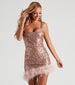 This body-hugging beauty showcases a glamorous sequin design and diva-liscious marabou trim perfect for a dressy night out! Step out in the Scarlett party dress featuring a sleeveless square neckline, tank-style straps, a bodycon silhouette, and an asymmetrical hem. The formal dress is composed of sequin knit fabric with lining and minimal stretch. Complete the look with a glam hair accessory.