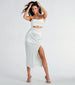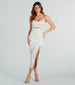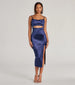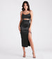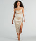 Radiate elegance in a formal dress that showcases your timeless style! Seona features a pleated cowl neckline, spaghetti straps, a cutout at the midriff, and a midi-length silhouette accented with a high side slit. The dress is composed of a silky-satin fabric that offers a form-hugging fit with a moderate stretch. Complete the look with rhinestone heels and a clutch.