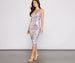 Sparkle and shine in a dress that brings the glamour to your evening. Alina features a sleeveless V-neckline with a sheer mesh inset, tank-like straps, an iridescent sequin scroll print, and a midi length silhouette. Aline is composed of a lined mesh fabric that offers a form hugging fit with a slight stretch. Complete your formal outfit with glitter heels and a dainty rhinestone bracelet.