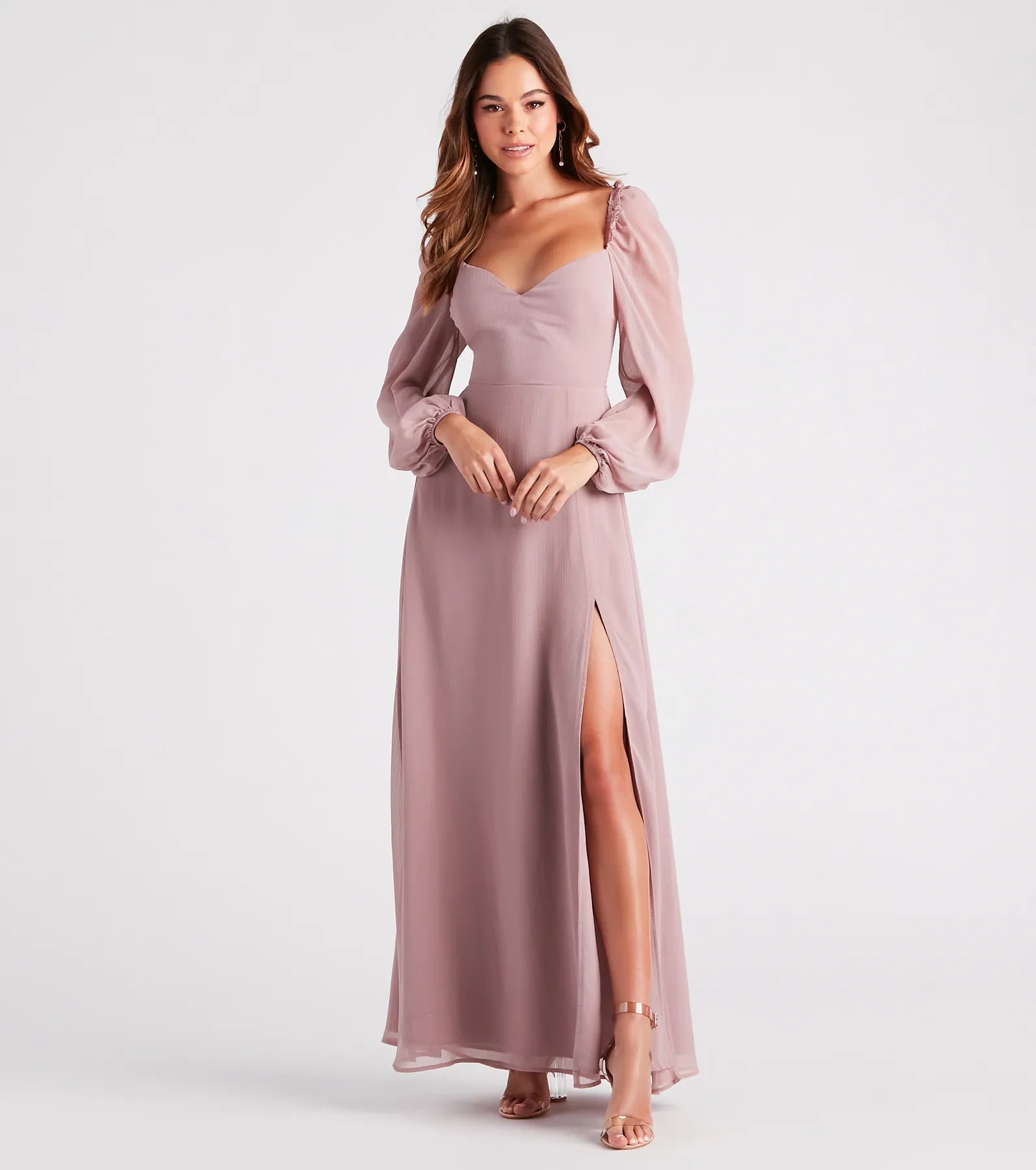 Everyone will marvel at you looking like beauty in this chiffon maxi dress perfect for wedding showers or dressy dates! It features sheer peasant long sleeves, a sweetheart neckline with a padded bust, a smocked back, and a flowy long hem with a front slit. The dress is composed of airy chiffon fabric with a smooth woven lining. Complete the look in chic heeled sandals.
