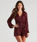 Shimmer and shine under the twinkling lights in this adorable sequin romper that is perf for NYE! It features a low V-neckline with a wrap-front design, long balloon sleeves, a fitted high waist with a tie-front to create a cinched silhouette, and shorts with a relaxed fit. The sequin embroidered knit fabric includes a knit lining. Style with rhinestone booties!