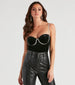 Show up to stun in this velvet bodysuit that showcases plenty of glamour! It features a sleeveless sweetheart neckline with padded cups, adjustable spaghetti straps with radiant rhinestone embellishments that continue to a rhinestone underbust trim, and a knit bottom with dual snap-button closures. The smooth velvet fabric offers a moderate stretch. Complete the look in faux leather pants.