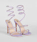 Show off your signature glam style with these radiant rhinestone spiral stiletto heels! They feature an open square toe, a double strap design across the foot, a trendy spiral strap design that wraps around the leg, mini rhinestone embellishments on the straps, and a tall stiletto heel. The faux leather material features a stunning metallic sheen. Pair these heels with a party dress and a sparkly clutch!