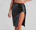 Keep it sleek and sultry with a bodycon skirt that enhances curves. The skirt features an elastic high-rise waist, a bodycon fit, and a midi-length hem with a high side slit. The skirt is composed of a lined faux leather fabric that offers a form hugging fit with a moderate stretch. Complete look with a bustier.