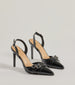 A pair of sleek faux leather stiletto pumps showcasing a trendy buckle strap detail and an adjustable sling back strap for a perfect fit. Pair with a dress for date night.