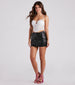 Show off a sleek style for your next night out with the girls in this trendy faux leather mini skirt! It features a high-rise waist with an asymmetric cross-over design, a front button closure, two front and back pockets, a mini-length hem, and a form-hugging fit. Complete the look with a corset top and strappy heels.