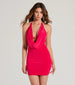 Turn heads tonight in this sleek knit mini dress! It features a cowl halter neckline with tie closure with a hidden bar trim that adds a touch of sultriness. Show off your figure with the bodycon silhouette, and make a daring statement with the open-back design accented by a bar trim. Complete the look with rhinestone earrings and heels.