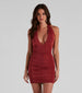 This slinky and chic halter mini dress will give you a gorgeous curve-hugging silhouette. It features a sleeveless V-neckline, halter straps, ruched detailing down the sides and back, and a mini-length hem. The smooth slinky knit fabric offers plenty of stretch. Style with strappy heels.