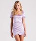 You'll be smitten over this satin short dress - a chic option for bridal showers, dressy brunches, and parties! The mini dress features adorable puff short sleeves, a square neck, and a side pleated seam that highlights your curves along the bodycon, faux wrap silhouette. Complete the look in heeled mules.