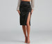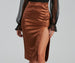 Smooth and sleek, this satin midi skirt is perfect for day-to-night looks! It features a high-rise waist, front slit accent, and a bodycon fit with a moderate stretch. Complete the look with pointed-toe boots.