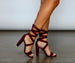 Keep it poised in stylish heels that bring that sophisticated look to your outfit! The heels feature a closed-back, lace-up straps, an open almond toe with a strap over the toe, and a block heel. The heels are composed of a faux suede material. Complete look with a blouse and pencil skirt.