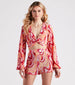 Create a fab retro look for spring break with this trendy printed crop top! It features a deep V-neckline with a twist-front design, long peasant sleeves with cinched hems, a fitted cropped hem, and an all-over eye-catching swirl print pattern. The lightweight plisse woven fabric includes a front knit lining. Style with the matching shorts and clear mules.