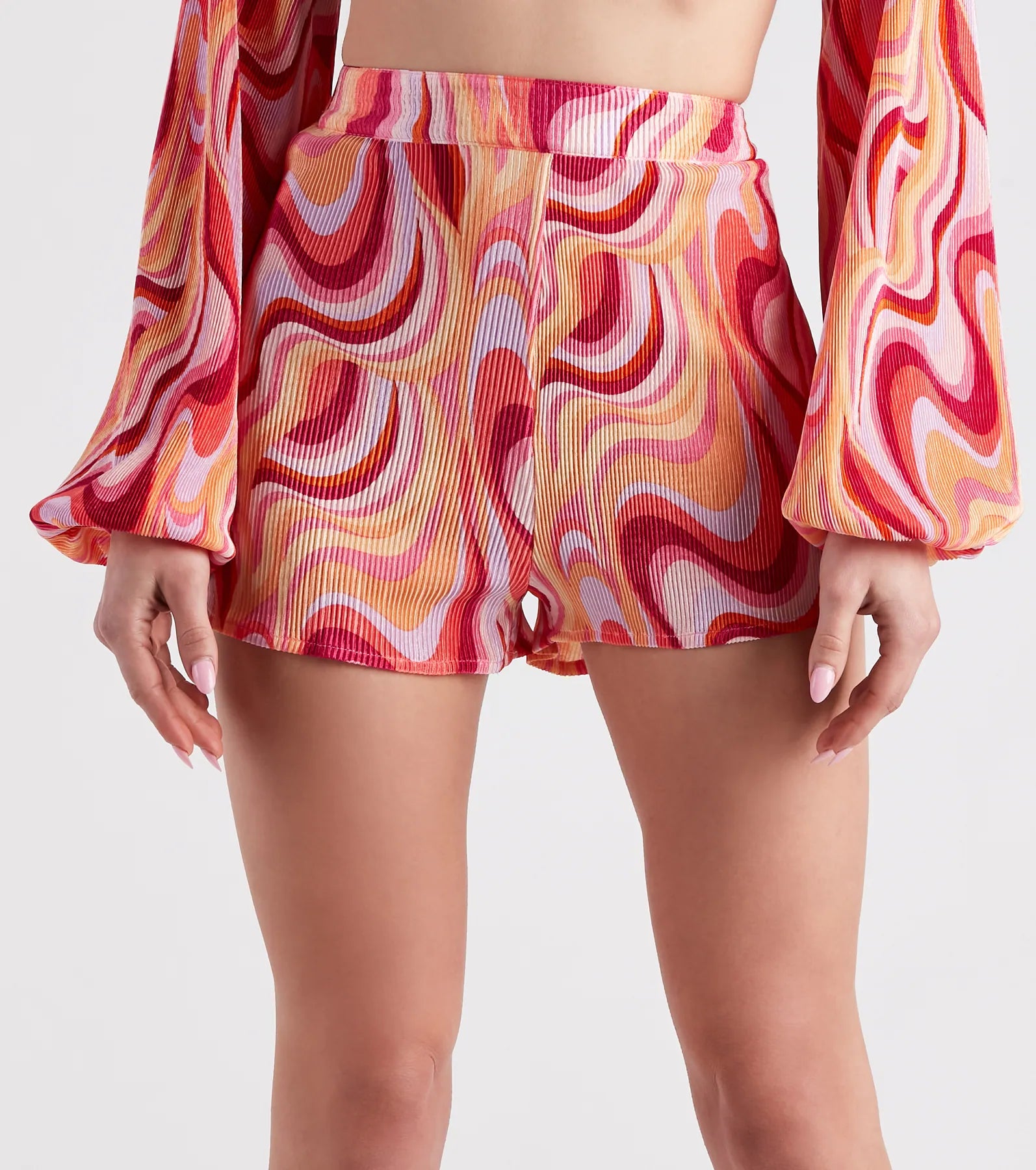 Create a fab retro look for spring break with these trendy printed shorts! They feature a high-rise banded waist, a relaxed fit, and an all-over eye-catching swirl print pattern. The lightweight plisse woven fabric offers no stretch. Style with the matching crop top and clear mules.