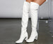 You'll be so seductive in this pair of thigh-high boots! They're made of faux patent leather with an almond toe, block heel, and a side zipper closure. Wear them with a bustier and mini skirt for your next night out.