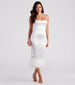 Forever timeless and classic, the Sofia formal satin dress embodies the 90s chic style perfect for date nights, dances, or cocktail soirees! She features a sleek and sleeveless square neck, adjustable spaghetti straps for a customizable fit, and a form-hugging silhouette with a back slit accent and feather trim midi hem. The formal dress is composed of a lustrious satin-lined fabric with a moderate stretch. Style with stiletto mules and a clutch to complete the look!