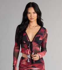 Serving soft with a wink. This sheer floral mesh top brings the flirt with ruffled edges, lace trim, and a tie-front that keeps things just bold enough. Perfect for date nights or casual slays.